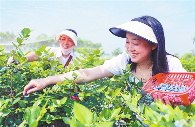 5月26日,在瑞昌市赛湖农场蓝莓种植基地,游客们正在采摘蓝莓,拍照“打卡”。近年来,赛湖农场依托区位优势,大力发展近郊游,因地制宜种植蓝莓、葡萄、西瓜、火龙果等,打造农旅融合田园观光综合体,吸引了大量游客前来休闲、采摘,带动了农民增收。