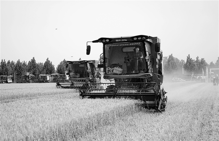 | 6月2日,在临沂市郯城县庙山镇,参加小麦机收减损技能大比武的农机手驾驶联合收割机在收获小麦。当日,山东省“三夏”生产开机暨小麦机收减损技能大比武启动仪式在山东临沂郯城县举行,标志着山东省6000多万亩小麦陆续集中收获。新华社记者 徐速绘摄 |