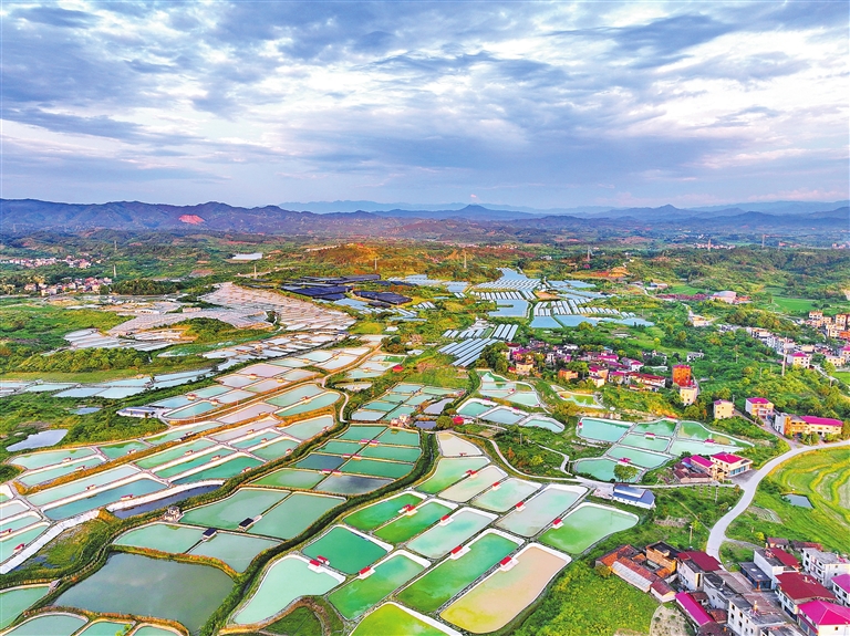近日,南丰县莱溪乡的一处甲鱼养殖基地,鳞次栉比的甲鱼塘在夕阳映衬下呈现五彩斑斓的景象,宛如大自然的调色盘。作为中华鳖亲本养殖、种蛋种苗生产供应基地,南丰甲鱼种蛋、种苗供应量占全国市场近60%。特约通讯员 朱海鹏摄