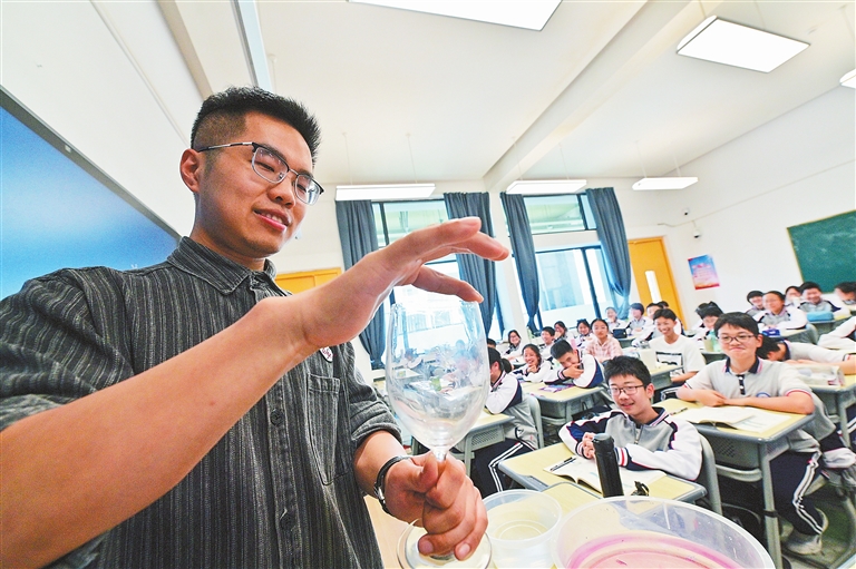 “你们猜猜看,把这只装满水的玻璃杯用纸片盖紧,倒过来后水会不会流出来呢?”4月15日,夏振东在课堂上向学生们展示了一个关于大气压强的覆杯实验。讲台下,同学们伸长脖子、睁大双眼,目不转睛地盯着讲台上的实验器具,心中充满了好奇与期待。“夏老师就像‘魔法师’,把书本上抽象的知识变得生动而具体。”学生汪梓瑶兴奋地说。