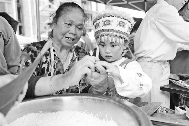 | 6月2日,永丰县恩江镇万尚跃进花园小区,孩子们跟着老人学包粽子,体验传统民俗。通讯员 袁雪彬摄 |
