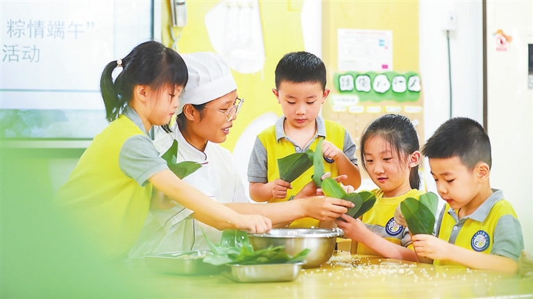 ▶6月3日,南昌市出新幼儿园的孩子们在老师指导下包粽子。端午节临近,该园举办多场民俗体验活动,让孩子们在欢声笑语中感受传统文化。 本报全媒体记者 张翰林摄