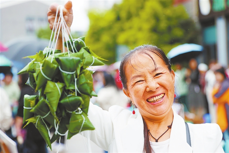 6月3日,重庆市黔江区舟白街道举办迎端午民俗文化活动,一名参加包粽子比赛的选手展示自己包的粽子。新华社发 (杨敏摄)
