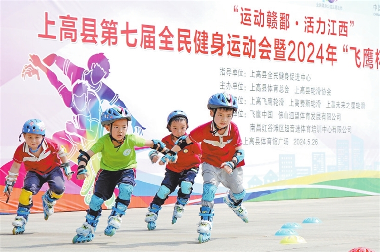 5月26日,孩子们在上高县体育馆广场参加滑轮滑比赛,体验“速度与激情”。近年来,上高县持续开展“体育赛事进校园、进单位、进社区、进企业”等系列活动,助力文、体、旅深度融合发展。