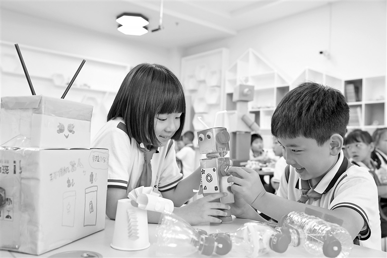 6月5日,浙江省湖州市德清县乾元镇中心小学的学生们利用废旧物品进行创作。