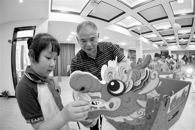 6月7日,在南昌市青云谱区施尧村一老一小幸福院,孩子们在舨王庙龙舟赛非遗传承人吴广凡的指导下,制作龙舟手工艺品、学习包粽子等,在欢乐的氛围中迎接端午节的到来。