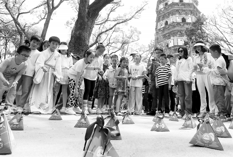 小朋友体验“套粽子”游戏。