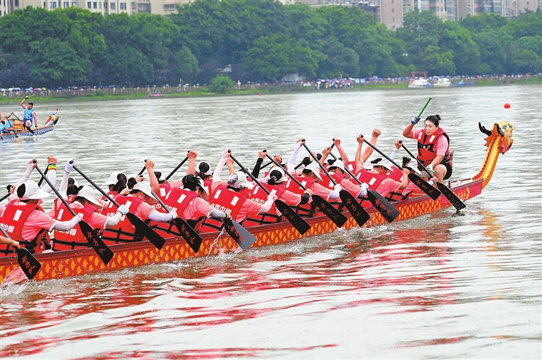 6月10日,赣州市章贡区水西镇龙舟赛开赛。龙舟破浪前行,选手奋勇争先,为观众献上一场精彩的龙舟竞渡。通讯员 严 锋摄