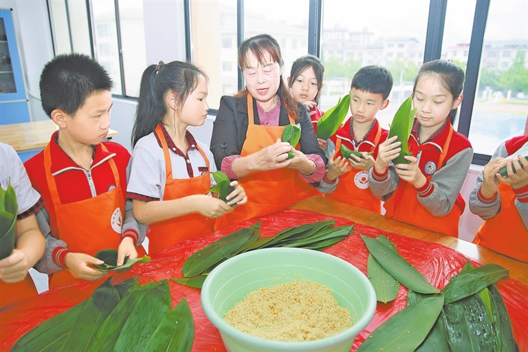 近日,靖安县第一小学师生与部分学生家长一起包粽子,让学生在实践中体验传统民俗。 本报全媒体记者 吴福清摄
