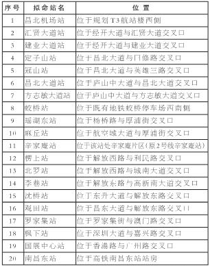 南昌轨道交通集团有限公司拟命名南昌市轨道交通1号线北延、1号线东延及2号线东延工程运营期车站名称: