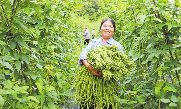 6月3日,新余市渝水区良山镇垣下村豆角种植基地,村民在采摘豆角。近年来,垣下村大力发展豆角、玉米、辣椒等特色种植产业,助力农业增效农民增收。通讯员 廖海金摄