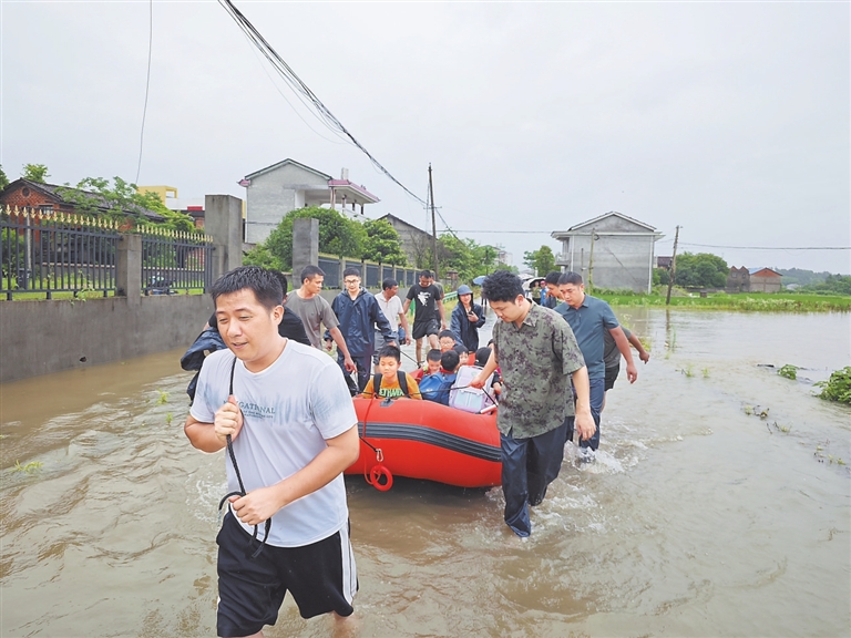 6月14日,在乐安县公溪镇荷陂村,镇村干部正在转移受灾群众。连日来,由于持续强降雨,乐安县各地出现不同程度的汛情。当地党员干部全力做好防汛救灾工作,切实保障人民群众生命财产安全。