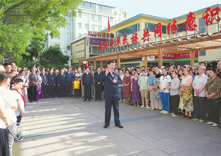 傍晚时分,社区广场十分热闹,居民们看见总书记来了,纷纷围拢过来,热烈鼓掌欢迎。习近平亲切地对大家说,时隔4年,我再次来宁夏看望各族干部群众,见到大家非常高兴!中华民族是一个大家庭,各族人民要像石榴籽一样紧紧抱在一起。要不断铸牢中华民族共同体意识,把各族人民的心紧紧连在一起,把各方面的力量广泛凝聚到一起,共同推进中国式现代化,共襄中华民族伟大复兴的盛举。