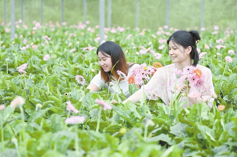 6月19日,宁都县田头镇璜山村鲜花基地内,游客在采摘非洲菊。近年来,该县结合市场需求,通过“龙头企业+公司+基地”“合作社+农户”等经营模式,引导农民通过花卉种植增收致富。本报全媒体记者 焦俊杰摄