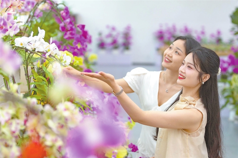 6月19日,庐山市白鹿镇花语世界,游客正在观赏选购蝴蝶兰。当地大力发展花卉研发、种植、繁育和观赏、交易全产业链,为旅游带来人气,也为乡村振兴注入活力。特约通讯员 韩俊烜摄
