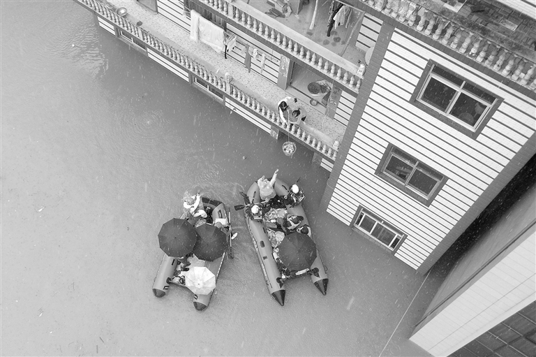 6月26日,乐平市浯口镇程家墩村被洪水围困,曙光救援队、蓝天救援队、红十字会等社会救援力量及当地党员干部用救援艇为村民送去生活物资。