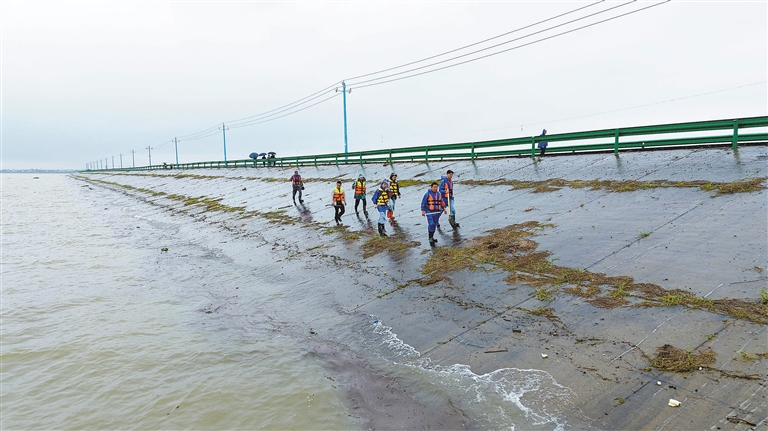 6月28日,庐山市蛟塘镇龙溪坝,当地干部群众全力以赴投入防汛工作。鄱阳湖水位突破警戒线以来,庐山市迅速调度人员到岗、物资到位,发布预警信息疏散地质灾害点附近居民,确保人民群众生命财产安全。特约通讯员 韩俊烜摄