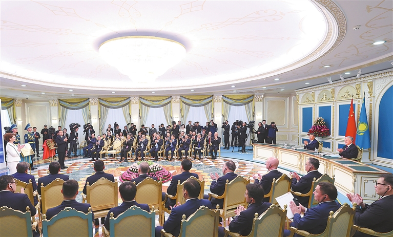 当地时间7月3日中午,国家主席习近平同哈萨克斯坦总统托卡耶夫在阿斯塔纳总统府共同出席阿斯塔纳中国文化中心、北京哈萨克斯坦文化中心和北京语言大学哈萨克斯坦分校揭牌仪式。