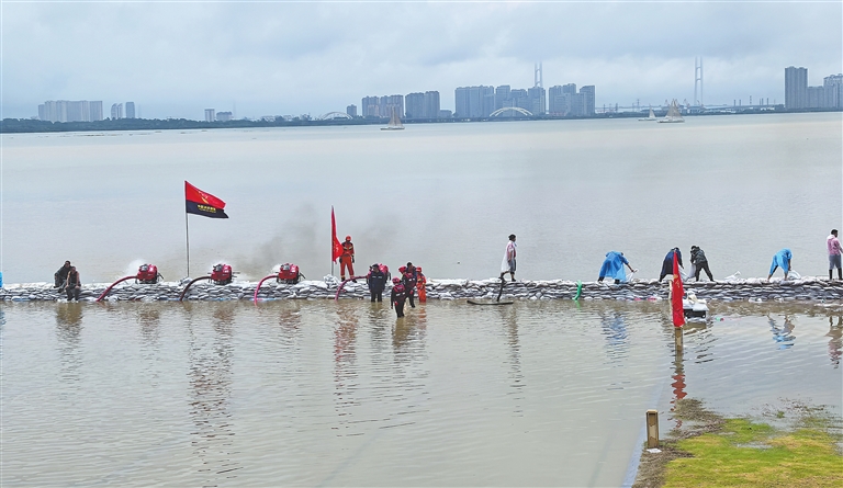 7月2日,受强降雨影响,九江市八里湖水位不断上涨,致使部分区域发生湖水漫堤。消防救援人员积极进行排涝除险, 及时消除隐患。