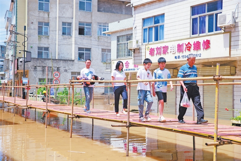 7月2日,湖口县马影镇主干道低洼处受淹,来往群众通行受阻,当地及时组织人员搭建一座长130米、宽1.5米的应急便民桥,为安全通行提供保障。本报全媒体记者 吴福清摄