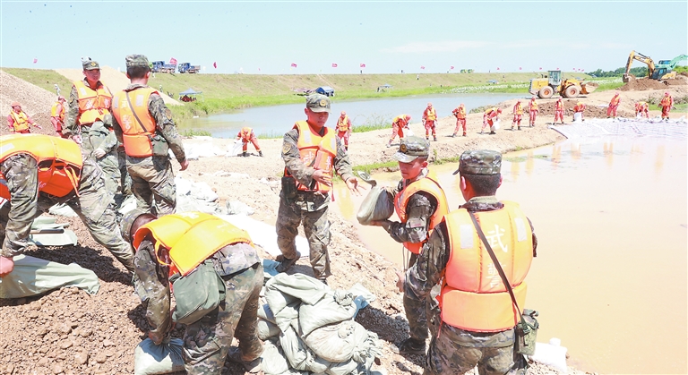 7月7日,武警江西总队官兵在鄱阳县角丰圩险情处置点除险。据了解,该圩堤7月3日晚发生管涌险情,上饶市和鄱阳县第一时间组织开展抢险工作,经过1000余名武警官兵、民兵、干部群众连续作战,险情已得到有效控制。