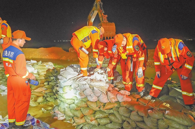 00后消防救援队员程鹏,作为前来角丰圩支援的第一批队员,已连续奋战了好几个日夜;鄱阳县公安局特巡警大队副大队长王品中,带领由50名特警队员组成的应急突击队,夜晚坚持巡堤查险并随时响应……从白天到黑夜,角丰圩堤上,一支支由当地党员干部、武警官兵和民兵等组成的队伍坚守在防汛一线。他们的脚步和身姿,让一面面鲜艳的党旗在防汛大堤上高高飘扬。