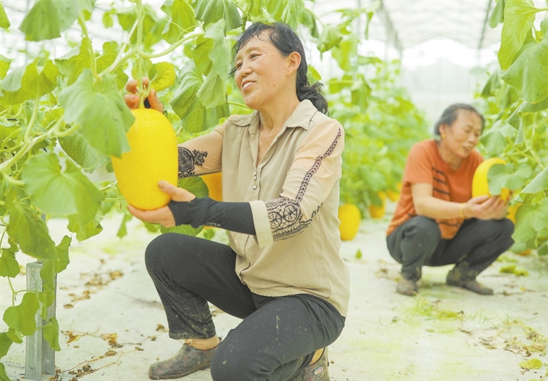 6月30日,位于万年县陈营镇石鼓村的万年中科汇农数字农业产业园内,村民在采摘哈密瓜。该产业园打造“互联网+农业灌溉管理体系”,实现“百亩农场、一键管理”,带动传统农业向现代农业全面转型。特约通讯员 徐声高摄