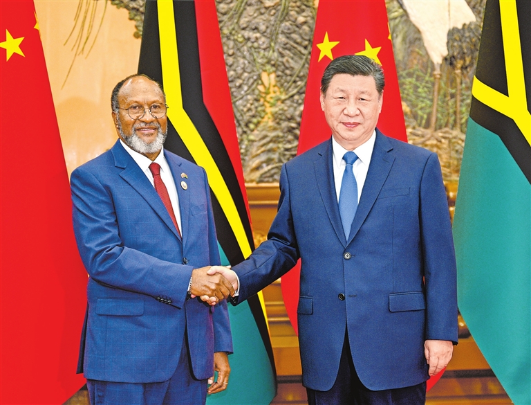 习近平强调,中国坚持大小国家一律平等,坚持义利相兼、以义为先,不寻求大国竞争,不谋求地缘势力范围,不干涉别国内政,不逼迫别国选边站队,始终站在历史正确一边,站在公平正义一边。中国是太平洋岛国地区和平共处、共同发展的推动者和贡献者。中国在联合国的一票永远属于发展中国家。中方从推动构建人类命运共同体的角度看待和重视同太平洋岛国关系,愿继续为岛国经济社会发展和民生改善提供力所能及的帮助,支持岛国加快实现自主、可持续发展目标。