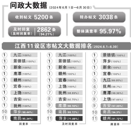 本报讯 (大江网全媒体记者涂文华 信息日报全媒体记者陈志燕)7月12日,大江网《问政江西》栏目组6月问政大数据出炉。数据显示,6月1日至6月30日,栏目组共收到群众投诉建议帖文5200条,其中3038条帖文证据相对充足、内容详实,已转到各职能部门办理。本期共收到2985条回复,其中及时回复2862条,及时回复率94.21%,整体满意率95.97%。景德镇、新余、宜春表现亮眼,及时回复率和满意率均为100%。