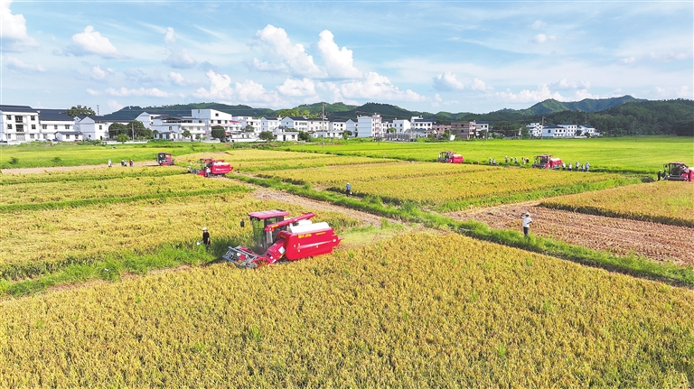 7月11日,在宁都县长胜镇中江村,农机手在操作收割机抢收早稻,确保粮食颗粒归仓。