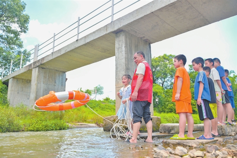 近日,在赣州市赣县区三溪乡下浓村小溪边,志愿者正在给学生示范讲解防溺水急救知识,提高学生安全意识和自救自护能力。本报全媒体记者 焦俊杰摄