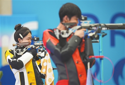 7月27日,中国选手黄雨婷(左)/盛李豪在比赛中。当日,在法国沙托鲁举行的巴黎奥运会射击10米气步枪混合团体决赛中,中国选手黄雨婷/盛李豪夺冠,赢得巴黎奥运会首枚金牌。