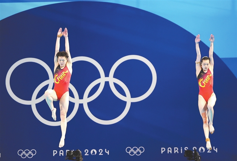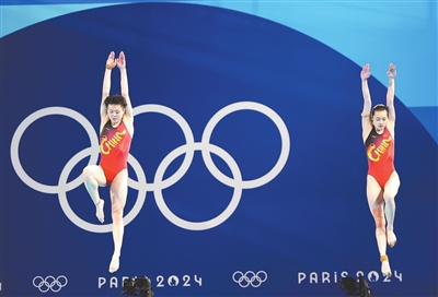 7月27日,中国选手昌雅妮(右)/陈艺文在比赛中。当日,在巴黎奥运会跳水女子双人3米板决赛中,中国选手昌雅妮/陈艺文夺得金牌。