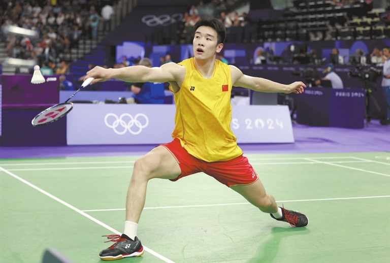 7月28日,中国选手李诗沣在比赛中回球。当日,在巴黎奥运会羽毛球项目男子单打小组赛中,中国选手李诗沣2比0战胜瑞士选手托比亚斯。 新华社记者 任正来摄