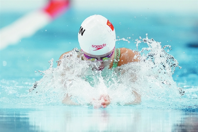 7月28日,中国选手唐钱婷在女子100米蛙泳预赛中。她以第二名的成绩晋级半决赛。当日,巴黎奥运会游泳项目预赛在拉德芳斯体育馆举行。 新华社记者 薛宇舸摄