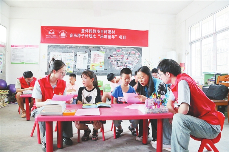乐安县乡镇青年人才党支部组建志愿服务队,与留守儿童结对子,陪伴其学习生活、健康成长。图为7月24日,党员志愿者在湖溪乡梅溪村“童心港湾”为留守儿童讲解防溺水安全知识。