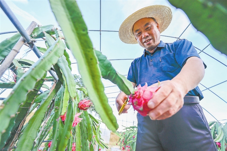 7月24日,湖口县张青乡荷塘村火龙果种植基地,果农正在采摘火龙果。近年来,该县积极引导农民调整产业结构,着力形成“一村一品”的现代农业发展格局。