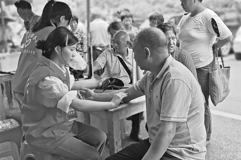 近日,赣南卫生健康职业学院“红药箱”社会实践队在赣州市赣县区白鹭乡开展“三下乡”社会实践活动。图为学生为群众进行爱心义诊。通讯员 马晓敏摄