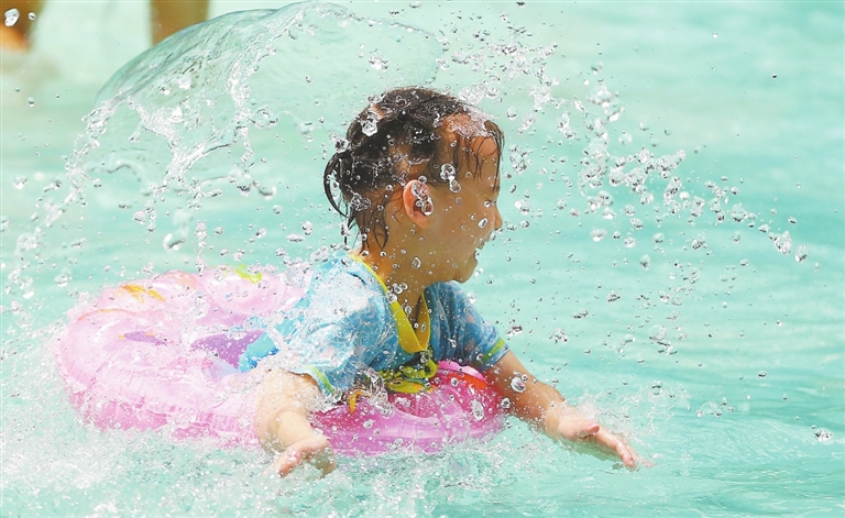 ◀8月4日,小朋友在山东省滕州市新盈泰温泉度假村水上乐园戏水。