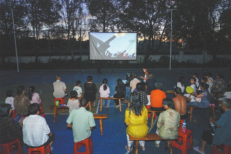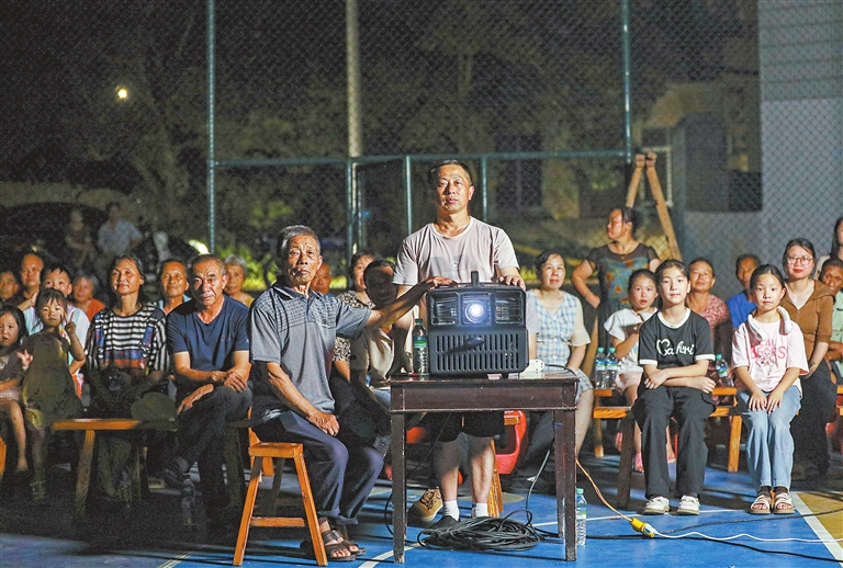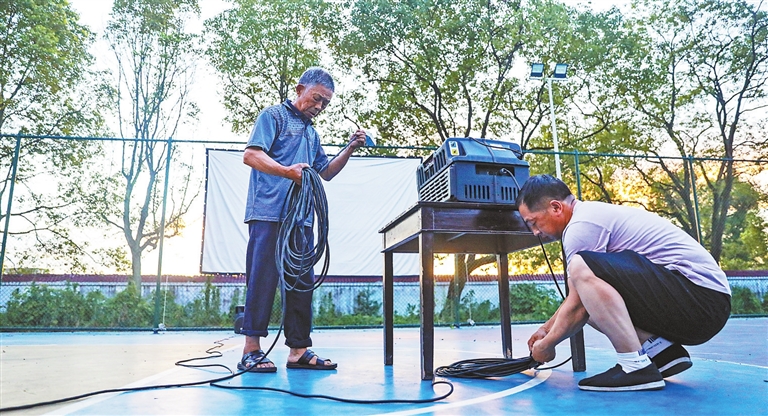 夏日的黄昏,夜色渐浓,在宜春市袁州区竹亭镇竹亭村的篮球场上,79岁的唐定德与儿子唐小卫正忙着搭建今晚的露天电影院,周边的村民也慢慢聚拢起来,准备享受这一场星光下的视听大餐。