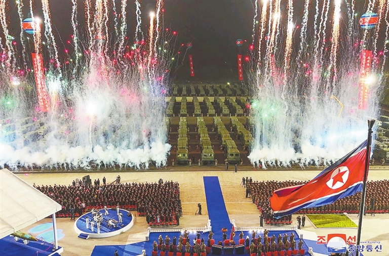 这张朝中社提供的照片显示的是在平壤举行的新型战术弹道导弹武器系统交接仪式庆祝画面。据朝中社5日报道,朝鲜4日在平壤举行新型战术弹道导弹武器系统交接仪式,共有250辆新型战术弹道导弹发射架车移交给边境一线部队。 新华社/朝中社