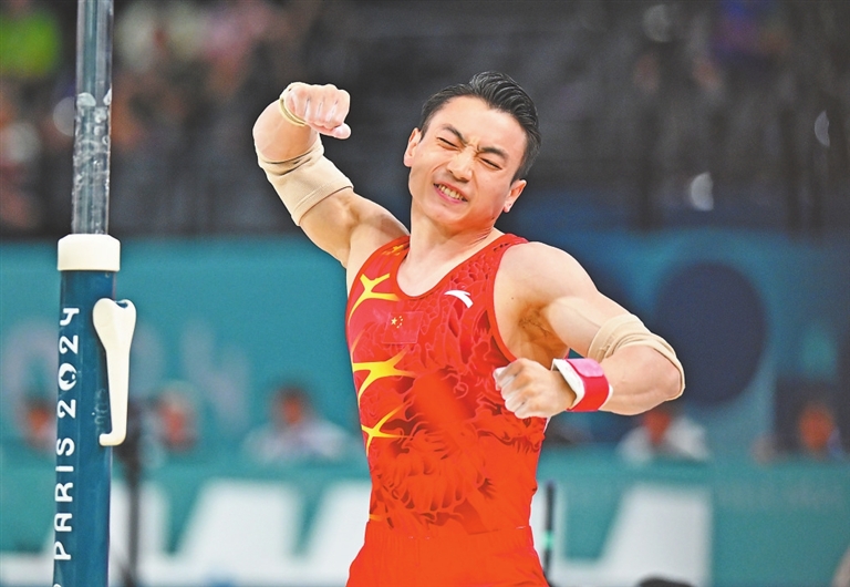 8月5日,中国选手邹敬园在比赛中。当日,在巴黎奥运会体操男子双杠决赛中,中国选手邹敬园获得冠军。