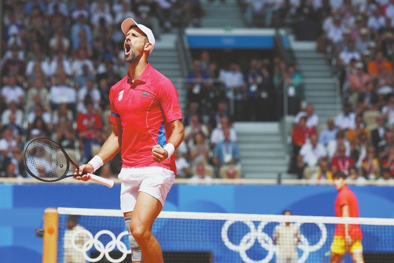 8月4日,焦科维奇(左)在比赛中庆祝得分。当日,在巴黎奥运会网球项目男单决赛中,塞尔维亚选手焦科维奇以2:0战胜西班牙选手阿尔卡拉斯,夺得冠军。