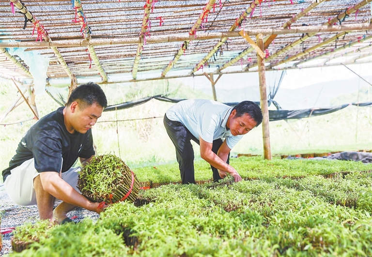 8月5日,在瑞昌市黄金乡界首村藜蒿种植基地,村民正在察看藜蒿苗长势。界首村采取“公司+农户”模式,发展藜蒿种植。基地接纳了10名村民务工,每人每年可增加收入1万余元。