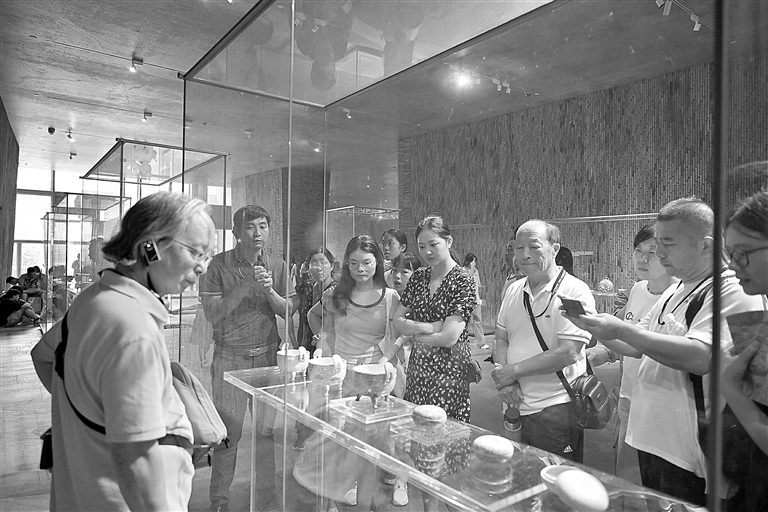 8月20日,在景德镇御窑博物馆内,游客正在欣赏瓷器展品,感受陶瓷文化。据悉,今年暑假,我省多家文博馆纷纷推出新展,江西省博物馆、景德镇御窑博物馆、八大山人纪念馆等多家场馆开启延时服务,满足游客参观需求。本报全媒体记者 王蕴蓉摄