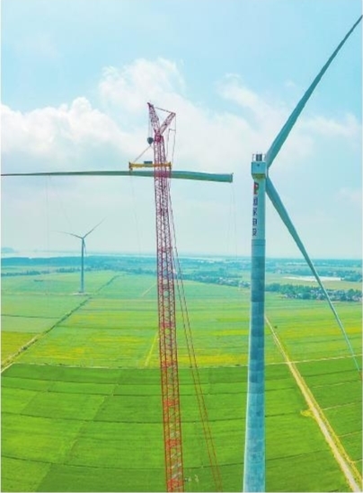 8月22日,施工人员在彭泽县棉船镇安装风力发电机组。彭泽棉船风电项目是我省2024年重点建设项目及省“十四五”期间碳减排示范项目,对于万里长江“第一零碳岛”的建设具有重要意义。该项目装机总容量100兆瓦,共18台风力发电机组,全容量投产后预计年上网电量2.44亿千瓦时。