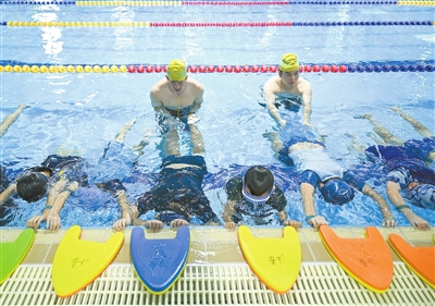 8月23日,南昌市青云谱区青云水城游泳馆内,学生在教练的指导下学习游泳技能。暑假期间,当地积极引导中小学生学习游泳安全知识,让学生掌握必备的自救、自护技能。本报全媒体记者 史港泽摄