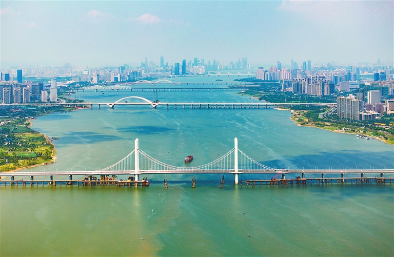 8月22日,高空俯瞰南昌一江两岸,水清岸美,7座跨江大桥如同巨龙般凌空飞架(由近到远为:洪州大桥、复兴大桥、东新赣江特大桥、生米大桥、朝阳大桥、南昌大桥、八一大桥),一张内畅外联的综合立体交通网在赣鄱大地上铺展开来。本报全媒体记者 史港泽摄