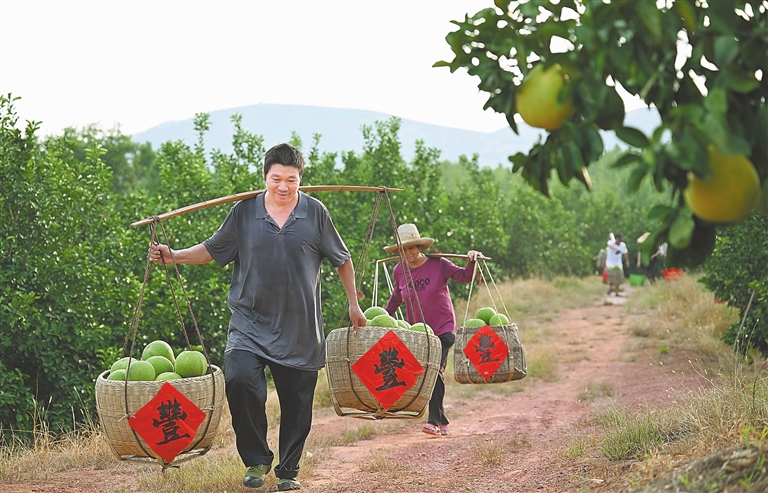 9月14日,在吉安市青原区富滩镇庭明农场,果农忙着采摘井冈蜜柚。据悉,青原区井冈蜜柚种植面积超3万亩,规模化蜜柚基地超100个,综合产值预计达亿元。