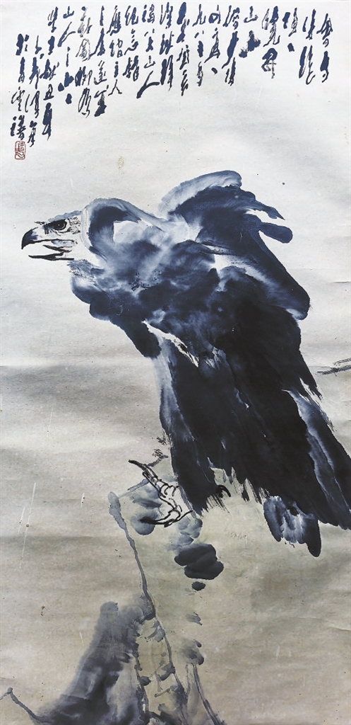 陕西著名画家王子武画了一幅《鹰》(下左二图),立于悬崖峭壁之上,水墨淋漓,造型准确,鹰眼锐利。画上题道:“会当凌绝顶,一览众山小。借少陵句写之。一九八三年癸亥深秋,拜谒八大山人纪念馆,应馆主人之属,成兹图,聊为山人之小小学生在献丑耳。”“聊为山人之小小学生”,这表达了王子武对八大山人的拜服之意。